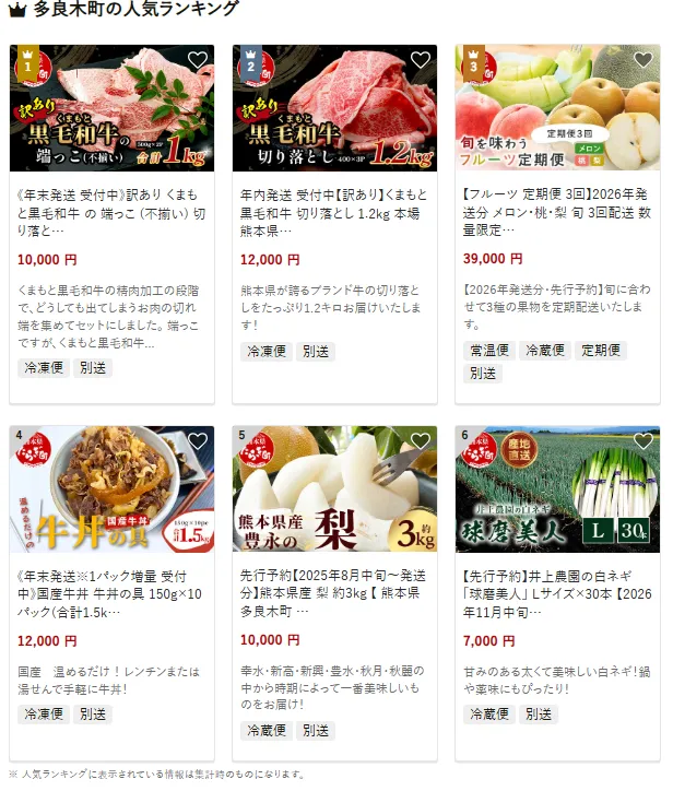 多良木町で人気の返礼品は熊本が誇るブランド牛「くまもと黒毛和牛」の訳あり切り落としです。1kgや1.2kgの大容量で年末までにお届けします。他にも季節の果物を3回に分けて楽しめる定期便も人気で、肥後グリーンメロンや球磨の桃、豊永の梨が旬に合わせてお届けします。