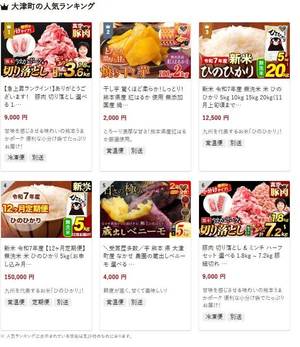 大津町で人気の返礼品は甘みとコクが特徴の「熊本うまかポーク」切り落としです。便利な小分けパックで、毎日の料理に重宝します。他にも熊本県産紅はるかを使用した無添加のしっとり干し芋や、九州を代表する銘柄米「ひのひかり」の無洗米も好評です。