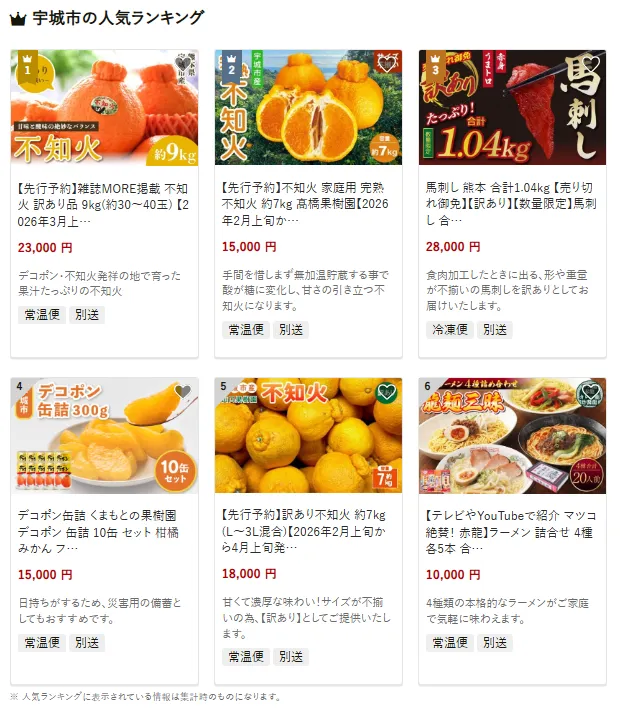 宇城市で人気の返礼品はデコポン®・不知火発祥の地で育まれた果汁たっぷりの「不知火」です。完熟まで無加温で貯蔵されることで酸味が抜け、甘みが際立つ逸品です。他にも数量限定の「訳あり馬刺し」も味はそのままでたっぷり楽しめると好評です。