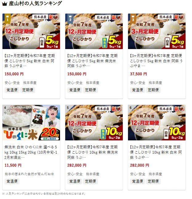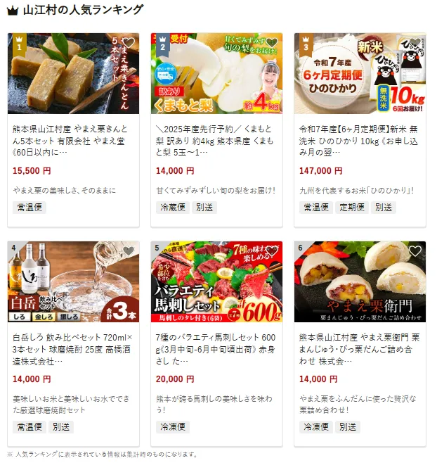 山江村で人気の返礼品は地元産のやまえ栗を使った「やまえ栗きんとん5本セット」です。栗の豊かな味わいをそのまま楽しめます。他にも2025年産の先行予約受付中の甘くみずみずしい旬の「くまもと梨(訳あり・約4kg)」や、九州を代表する銘柄米「ひのひかり」の無洗米10kgを6ヶ月定期便でお届けするプランも人気です。