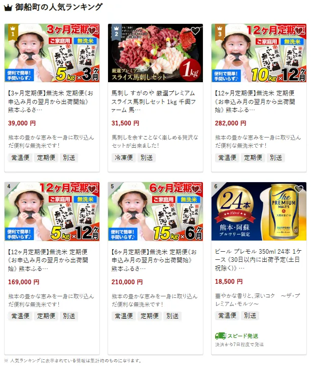 御船町で人気の返礼品は熊本県産の便利な無洗米です。3ヶ月・12ヶ月の定期便で、訳ありながら品質にこだわったお米です。他にも菅乃屋の厳選プレミアムスライス馬刺しセット1kgも人気で、新鮮な馬刺しを余すことなく楽しめます。