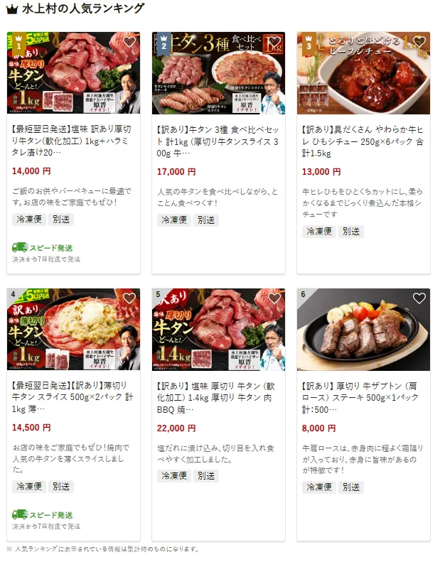 水上村で人気の返礼品は塩味の訳あり厚切り牛タン1kgとハラミタレ漬け200gセットです。他にも厚切りや薄切り、サイコロステーキが楽しめる牛タン3種食べ比べセットや、柔らかく煮込んだ牛ヒレひもシチューもおすすめです。
