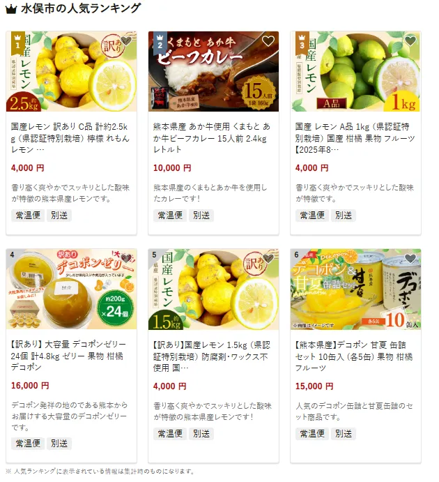 水俣市で人気の返礼品は香り高く爽やかな酸味が特徴の熊本県産レモン(訳あり2.5kgとA品1kg)です。他にも地元のあか牛を使ったくまもとあか牛ビーフカレー(15人前2.4kg)が人気です。