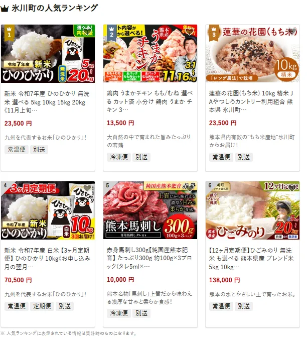 氷川町で人気の返礼品は九州を代表するブランド米「ひのひかり」の新米無洗米(5kg~20kg)です。他にももも肉・むね肉からお好みで選ぶことができる大自然の恵みを受けて育った旨み豊かな国産若鶏「うまかチキン」や、熊本県内有数のもち米産地としても知られている氷川町で作られた香り豊かな「蓮華の花園」もち米10kgが人気です。
