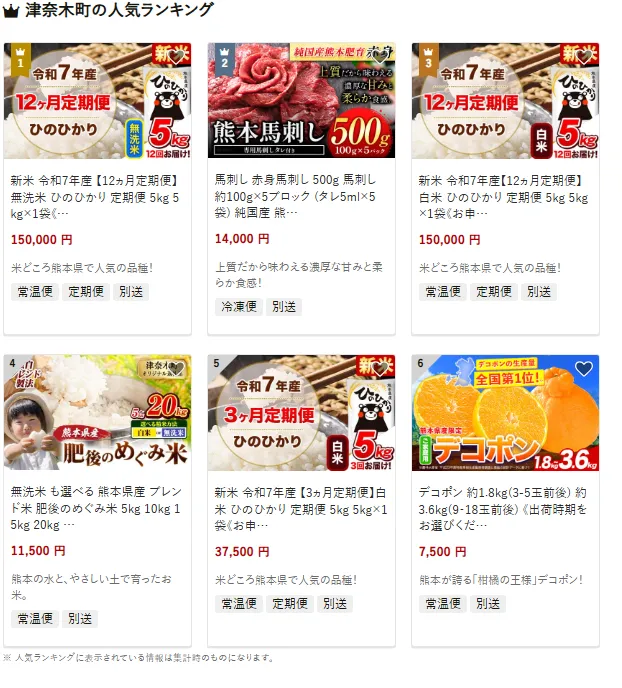 津奈木町で人気の返礼品は熊本県産の人気品種「ひのひかり」の新米を12か月定期便です。無洗米と白米から選べるため、毎月新鮮なお米を楽しめます。他にも濃厚な甘みと柔らかな食感が特徴の上質な熊本肥育の赤身馬刺しも人気です。