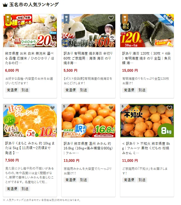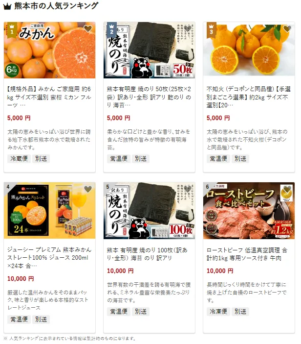 熊本市で人気の返礼品は太陽の恵みと熊本の地下水で育ったみかんや不知火(デコポンと同品種)です。規格外品のみかんは約6kgとたっぷりで、家庭用に最適です。他にも有明海産の香り豊かな焼のりも好評です。