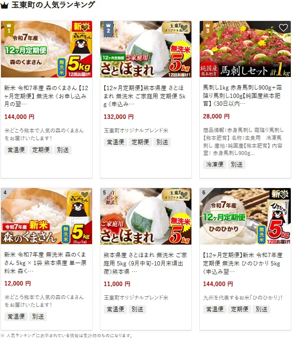玉東町で人気の返礼品は熊本県産の定番ブランド米「森のくまさん」と玉東町オリジナルのブレンド米「さとほまれ」の無洗米12ヶ月定期便です。どちらも新鮮な新米を毎月お届けします。他にも純国産の熊本肥育馬刺し1kgセットも好評で、赤身と霜降りの食べ比べが楽しめます。