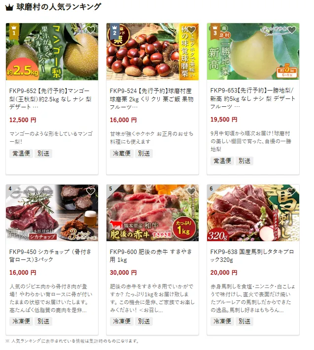 球磨村で人気の返礼品はマンゴーのような形が特徴の「マンゴー梨(王秋梨)」や、甘み豊かな「球磨栗」、そして美しい棚田で育った「一勝地梨」です。どれも季節限定の先行予約品で、旬の味覚をたっぷり楽しめます。