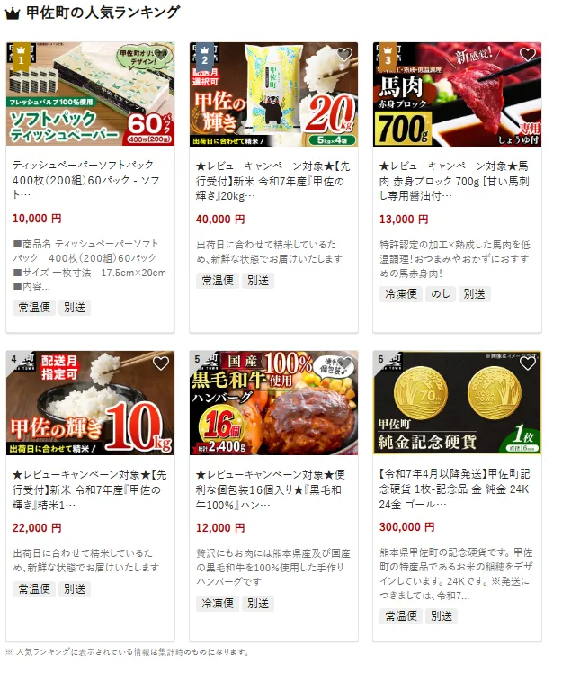 甲佐町で人気の返礼品は日常使いに便利なティッシュペーパーの大容量セットです。他にも出荷日に合わせて精米した新米「甲佐の輝き」20kgや、甘みと旨みが際立つ特許認定の加工技術を用いた熟成馬肉の低温調理品も人気です。
