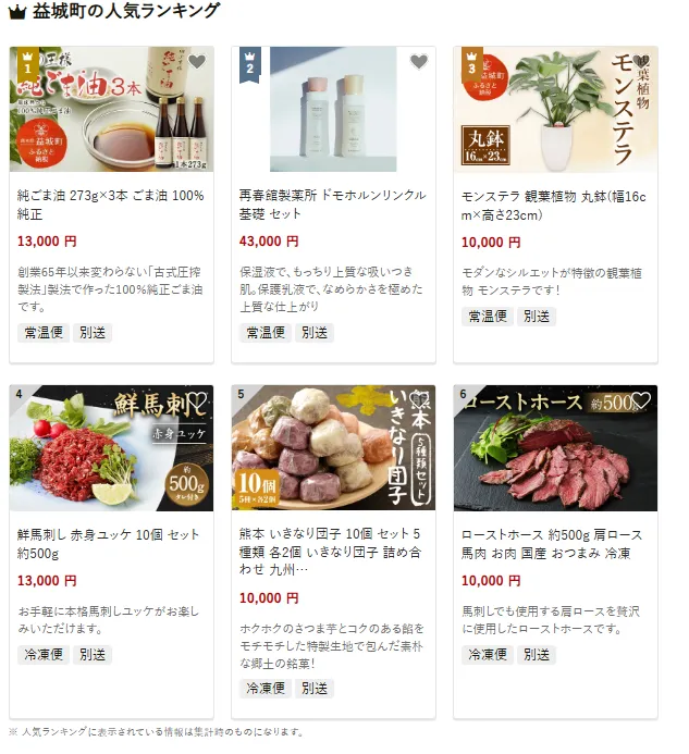 益城町で人気の返礼品は創業65年以上続く伝統の「古式圧搾製法」で作られた100%純正ごま油(273g×3本)です。他にも再春館製薬所の保湿液や保護乳液を含むドモホルンリンクル基礎セットや、インテリアに映えるモダンなシルエットの観葉植物モンステラが注目を集めています。