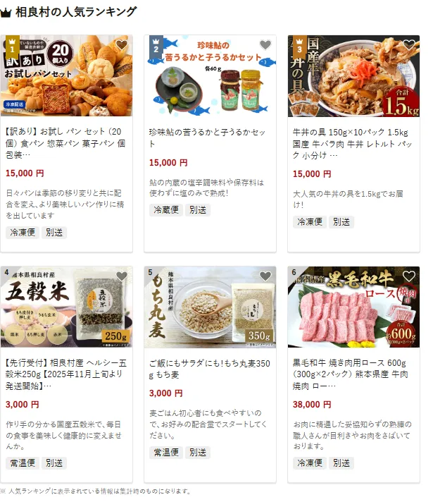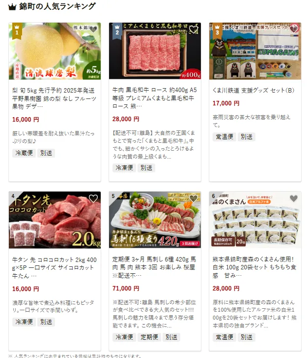 錦町で人気の返礼品は寒暖差が育んだ果汁たっぷりの「錦の梨」5kgが人気です。瑞々しく甘い梨は旬の味覚として多くの方がリピートしています。他にもA5等級のプレミアムくまもと黒毛和牛ロース約400gや、豪雨災害からの復興支援として「くま川鉄道 支援グッズセット」も話題です。