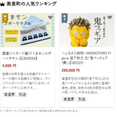 美里町で人気の返礼品は国産ジャガード織りの「くまモンスポーツタオル」です。他にも瀧下和之氏による個性的な「鬼フィギュア(黄)」も注目されています。