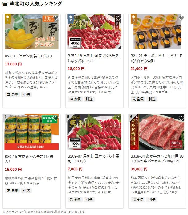 芦北市で人気の返礼品はジューシーな味わいが楽しめる「デコポン缶詰(10缶入)」です。他にも特産のデコポンを贅沢に使用したゼリーセットや、国産の希少部位を味わえる「さくら馬刺しセット」も高い人気を誇っています。