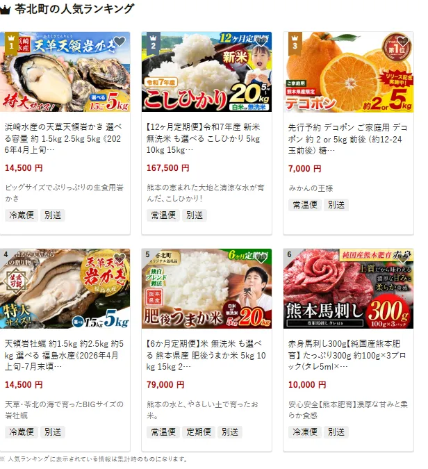 苓北町で人気よ返礼品はぷりぷりの大粒「浜崎水産の天草天領岩かき(約1.5kg〜5kg)」です。他にも熊本の豊かな大地と清らかな水で育った「こしひかり」の12ヶ月定期便や、糖度13度以上のみを厳選した甘くてジューシーな「デコポン(約2〜5kg)」が好評です。