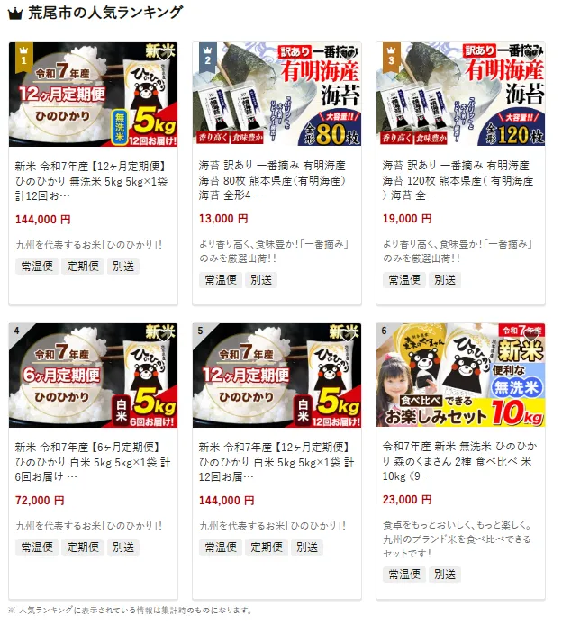 荒尾市で人気の返礼品は熊本県産のブランド米「ひのひかり」です。無洗米5kgを12ヶ月お届けする定期便は、ご家庭に嬉しい便利さと美味しさが魅力です。他にも香り高く食味豊かな有明海産「一番摘み海苔」は訳ありながら品質が高いと好評です。