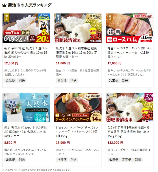 菊池市で人気の返礼品は熊本が誇る人気銘柄「ひのひかり」です。新米を無洗米や白米から選べます。他にも独自ブレンド製法で作られた「肥後清流米」や、旨み豊かなカタロース肉をたっぷり真空パックにした福留ハムも人気です。