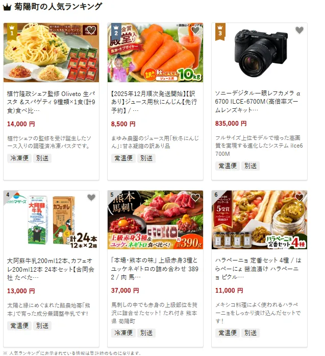 菊陽町で人気の返礼品は植竹シェフ監修のソース入り冷凍生パスタ9種セットです。他にも甘さが凝縮された訳ありの秋冬用にんじんジュース用や、台数限定で最新技術を搭載したソニーの高画質一眼レフカメラα6700Mも注目を集めています。