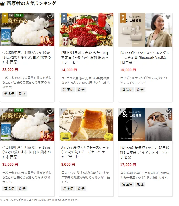 西原村で人気の返礼品は阿蘇の豊かな土壌で育った香り高い「阿蘇だわら」10kg(5kg×2袋)の精米です。他にも馬肉好きには、コリコリ食感が楽しめる訳ありの赤身馬刺し700gセットや、西原村オリジナルブランド「&Less」の高性能ワイヤレスイヤホンも注目の一品です。