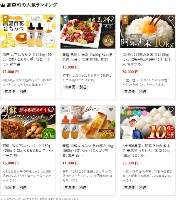 高森町で人気の返礼品は阿蘇の広大な花々から採れた爽やかな甘みの国産百花はちみつ(1kgセット)です。他にも鮮度にこだわった熊本産の馬刺し赤身(約400g)や、一粒一粒香りと甘みが感じられる阿蘇産の訳ありお米16kgセットもおすすめです。