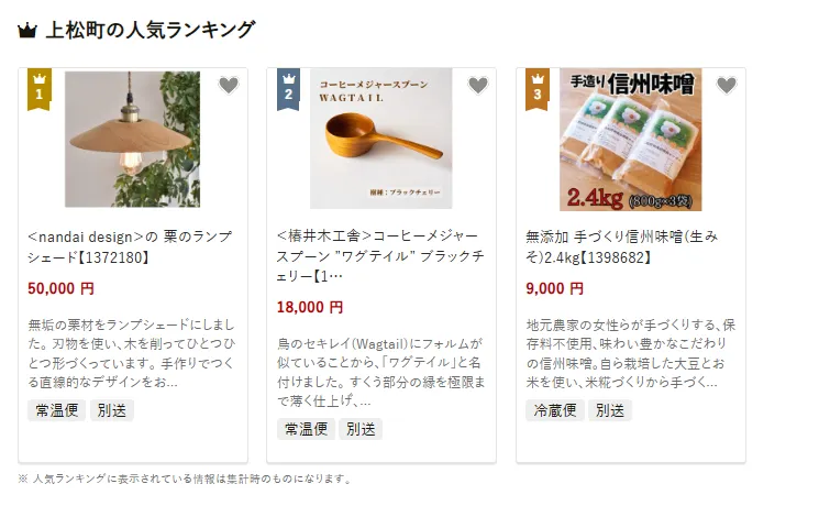 上松町で人気の返礼品は、無垢の栗材を使った「栗のランプシェード」です。木の温もりが感じられるデザインで人気を集めています。他には、椿井木工舎のコーヒーメジャースプーンや手作りの信州味噌(生みそ)も好評。寄付金は、森林資源を守る環境保全や、地域福祉の充実に役立てられています。