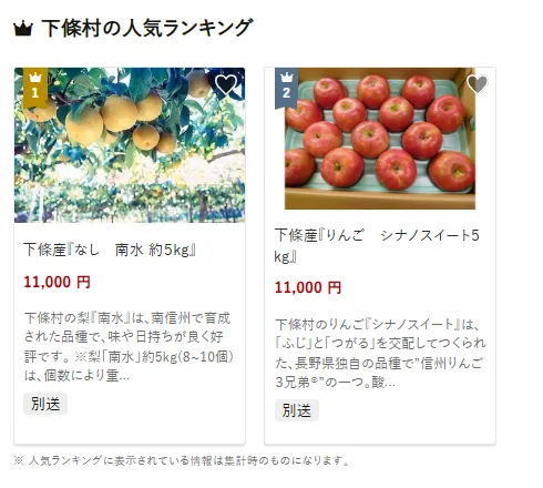 下條村で人気の返礼品は、下條村産「なし 南水 約5㎏」です。甘くてみずみずしい味わいが食卓を彩ります。他には、特産のりんご「シナノスイート」5㎏も人気です。寄付金は、安心して子育てできる環境整備や、住民の健康づくりを支える医療・福祉に活用されています。