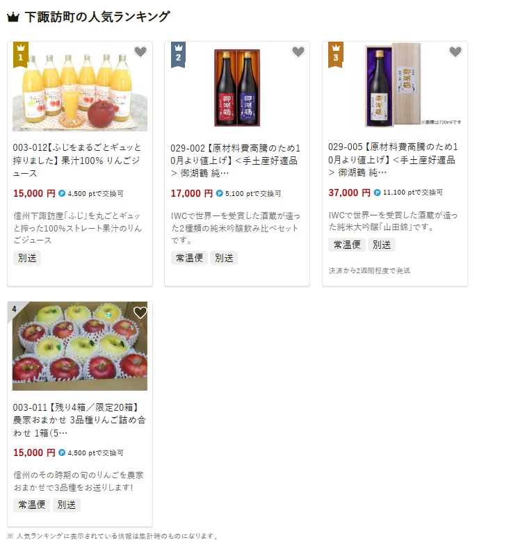 下諏訪町で人気の返礼品は、「ふじまるごとギュッと絞りました」果汁100%りんごジュースです。信州の自然の恵みを丸ごと絞った濃厚な味わいが楽しめます。他には、地元酒蔵の純米吟醸酒や、3品種詰め合わせりんごセットも人気。寄付金は、子どもや若者への教育支援や、高齢者福祉の充実に活用されています。