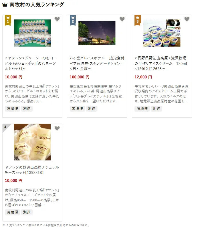 南牧村で人気の返礼品は、「ジャージーのむヨーグルト&シュッポッポのむヨーグルトセット」です。濃厚でコクのある味わいが人気を集めています。他には、八ヶ岳グレイスホテル宿泊券や滝沢牧場の手作りアイスクリーム、ナチュラルチーズセットも好評。寄付金は、子育て支援や地域医療、自然環境保護に活用されています。