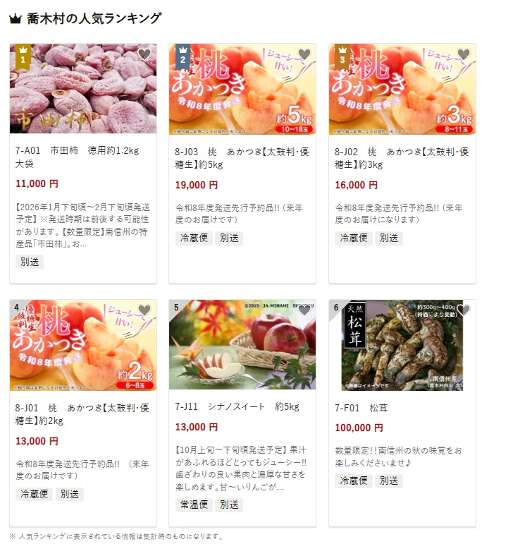 喬木村で人気の返礼品は、「市田柿」徳用 約1.2㎏です。長野県南部の特産として知られる干し柿で、自然の甘みが凝縮され、上品な味わいが魅力です。他には、果汁豊かな桃「あかつき」、爽やかな甘さのシナノスイート、秋の味覚を代表する松茸なども人気を集めています。寄付金は、子どもたちの学びを支える教育や、地域高齢者の健康支援、さらに果樹栽培など農業の活性化に活用されています。