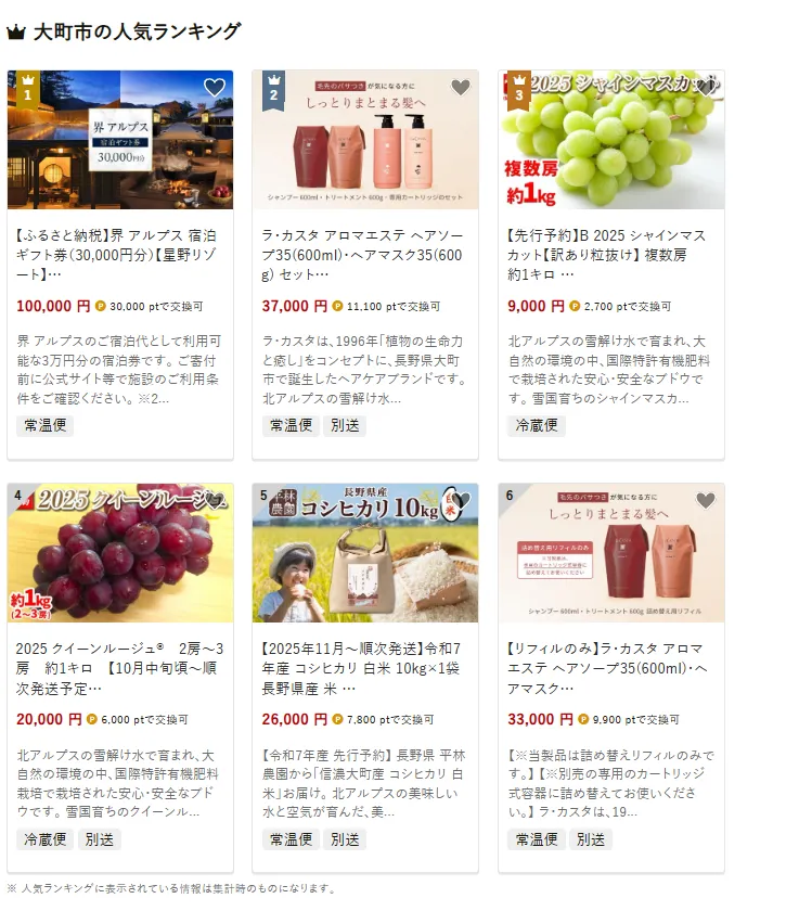 大町市で人気の返礼品は、アルプスの宿泊ギフト券(30,000円分)です。北アルプスの自然に囲まれたリゾートでゆったり過ごせます。他には、シャインマスカットやクイーンルージュ、信州産コシヒカリ10㎏も人気。寄付金は、教育支援や地域医療の充実、北アルプスの自然環境を守る活動に活用されています。