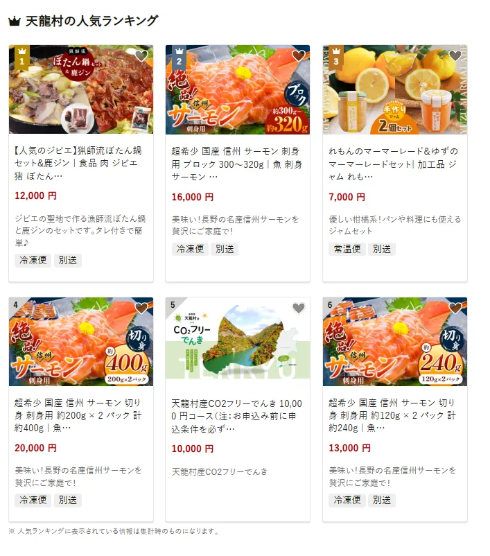 天龍村で人気の返礼品は、「猟師流ぼたん鍋セット&鹿ジン」のセットです。猪肉を使った滋味豊かな味わいが堪能できます。他には、信州サーモン刺身用やれもんのマーマレード%ゆずマーマレードのセットも人気。寄付金は、子育て支援や地域医療、豊かな自然を守る活動に役立てられています。
