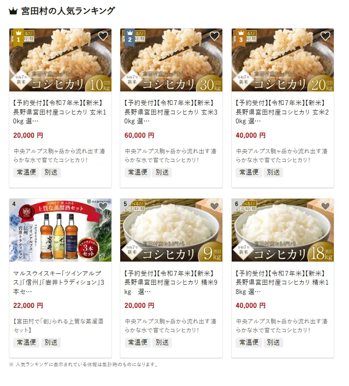 宮田村で人気の返礼品は、中央アルプスの清らかな水で育った「長野県産宮田村産コシヒカリ玄米 10㎏」です。粒立ちがよく、ふっくら炊き上がる自慢の玄米です。他には、マルスウイスキーのセットや長野県産宮田村産コシヒカリ精米9kgなども人気。寄付金は、子育て支援や学校教育の充実、また木曽駒ヶ岳を活かした観光・交流振興に役立てられています。