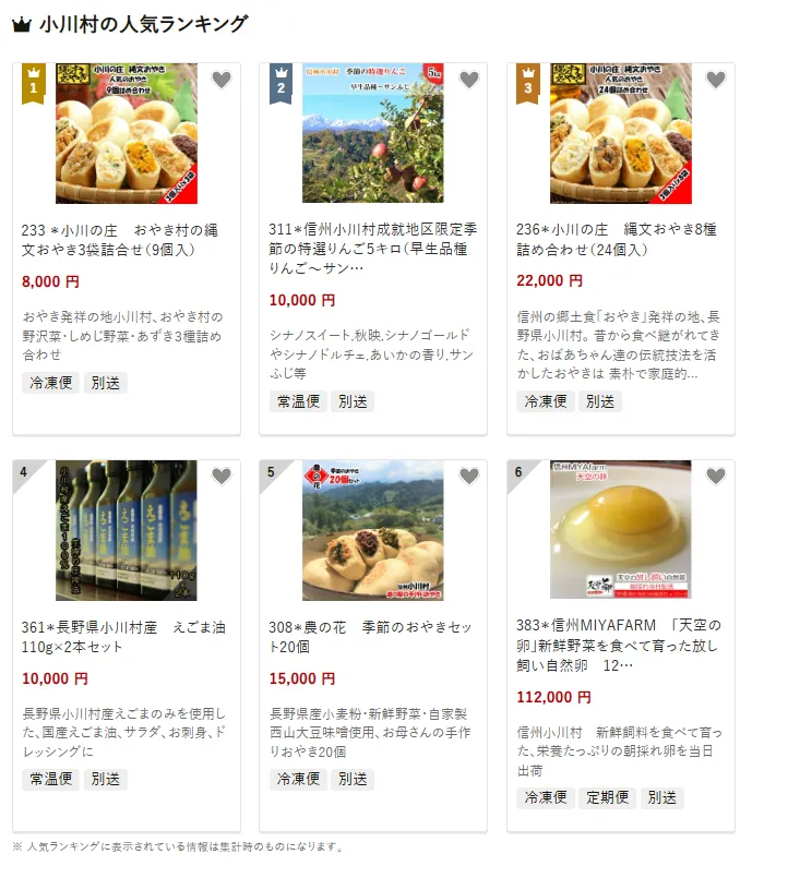 小川村で人気の返礼品は、「小川の庄 おやき村の縄文おやき3袋詰め合わせ(9個入)」です。地元野菜をたっぷり使った素朴な味わいが楽しめます。他には、信州特選りんごやえごま油、天空の卵なども注目を集めています。寄付金は、子育てや高齢者福祉の支援、さらには自然を守る環境保全に活用されています。