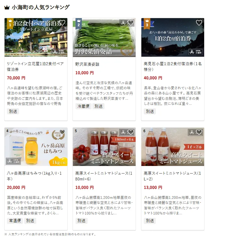小海町で人気の返礼品は、リゾートイン立花屋の1泊2食付ペア宿泊券です。八ヶ岳を望む温泉宿で癒しの時間を過ごせます。他には、野沢菜漬けや八ケ岳高原はちみつ、スイートミニトマトジュースなども好評。寄付金は、教育や医療の充実、さらに八ヶ岳高原の自然環境保護に活用されています。