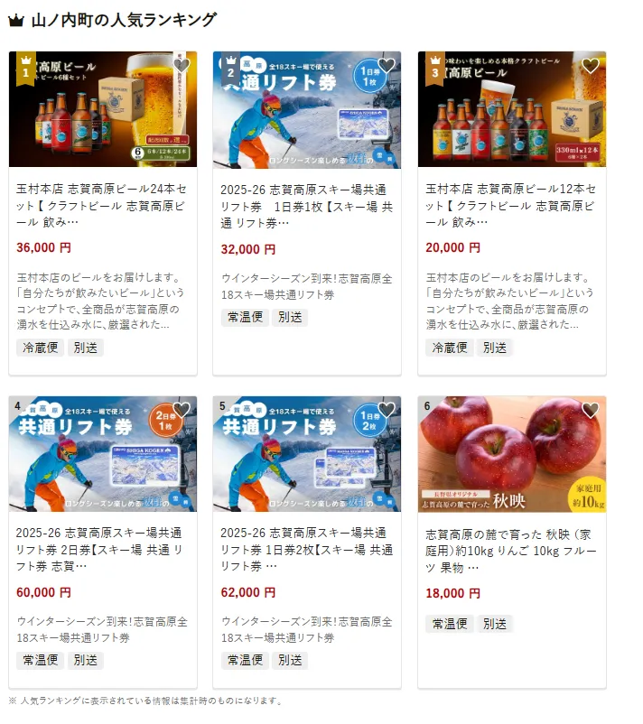山ノ内町で人気の返礼品は、志賀高原ビール24本セットです。地元の清らかな水で醸造された個性豊かなクラフトビールを堪能できます。他には、志賀高原スキー場共通リフト券1日券や秋映りんご10㎏も人気。寄付金は、子育てや観光振興、世界的スノーリゾートの環境整備に活用されています。