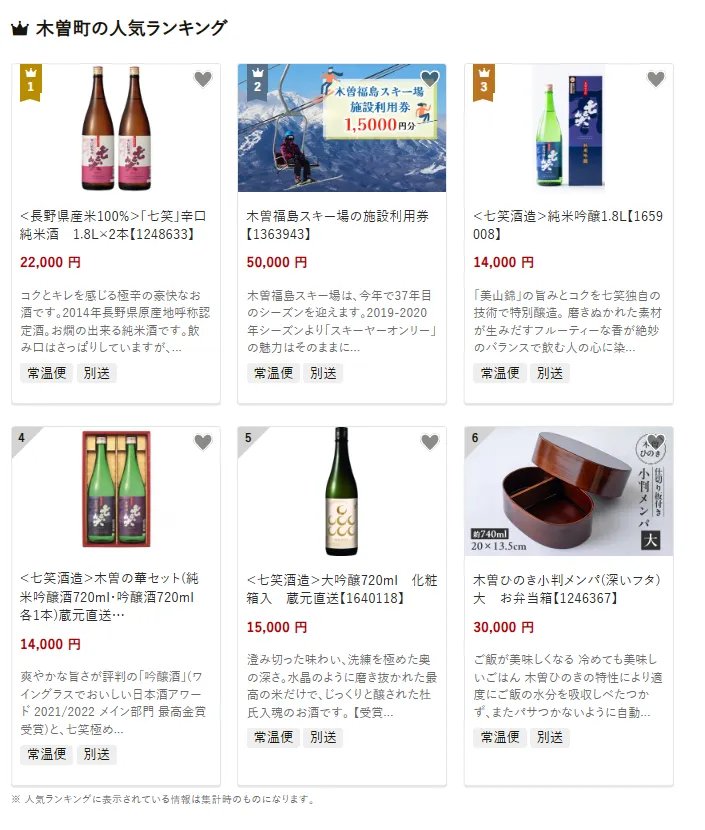 木曽町で人気の返礼品は、「長野県産米100% 七笑辛口純米酒 1.8L×2本」です。地元産米を使用したコクとキレのある純米酒で、食事に良く合う味わい。他には「木曽福島スキー場の施設利用券」や「七笑酒造 純米吟醸酒720mlセット」なども人気です。寄付金は、観光資源の保護や生活環境整備に活用されています。