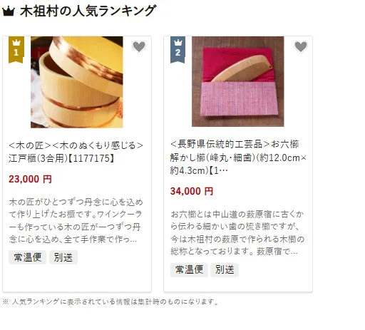 木祖村で人気の返礼品は、「木の匠<木のぬくもり感じる>江戸桶(3合用)」です。職人が一つひとつ丹念に仕上げた木工品で、食卓や日常に温もりを添えます。他には「長野県伝統的工芸品 お六櫛解かし櫛」も人気です。寄付金は、地域産業の振興や次世代育成に活用されています。
