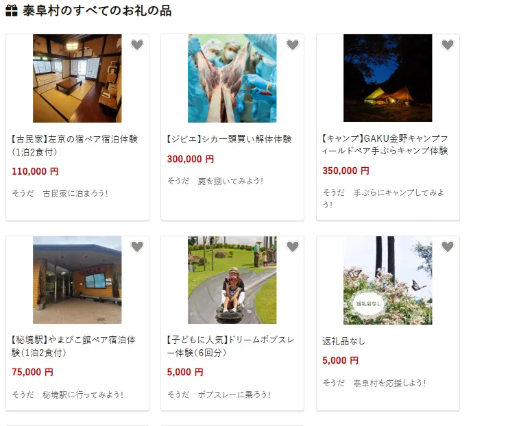 泰阜村で人気の返礼品は、古民家の左京の宿ペア宿泊体験(1泊2食付き)です。伝統的な建物で過ごす特別な時間を楽しめます。他には、ジビエ解体体験やGAKU金野キャンプ体験、ドリームボブスレー体験も用意されています。寄付金は、子どもたちの教育支援や、地域資源を活かした交流促進に活用されています。