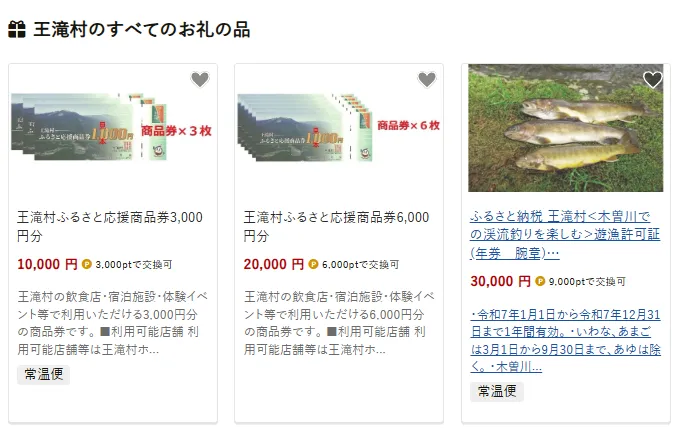 王滝村で人気の返礼品は、王滝村ふるさと応援商品券3,000円分です。宿泊や飲食、体験イベントなどに利用でき、村の魅力を満喫できます。他には、木曽川での渓流釣りを楽しめる遊漁許可証もあります。寄付金は、小規模校の教育支援や、高齢者の安心した暮らしを守る福祉施策に活用されています。