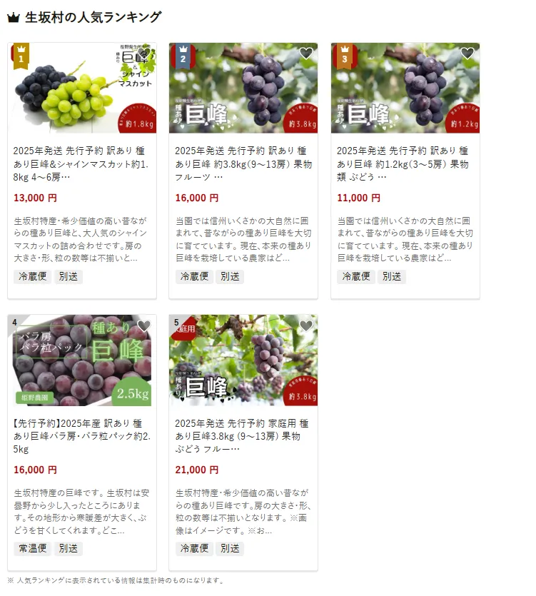 生坂村で人気の返礼品は、種あり巨峰とシャインマスカット 約1.8㎏(4~6房))です。甘みが強く粒の大きな巨峰や爽やかなマスカットを堪能できます。他には、訳あり品の種ありの巨峰もお得に楽しめるセットとして人気。寄付金は、教育や地域福祉の充実、果樹栽培を守る農業振興に活用されています。