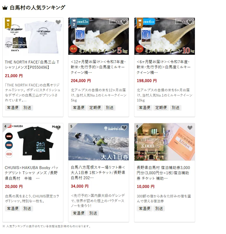 白馬村で人気の返礼品は、「THE NORTH FACE 白馬三山 Tシャツ メンズ」です。白馬三山をデザインしたスタイリッシュな一枚で、アウトドア好きや観光の記念品としても喜ばれています。他には、豊かな自然が育む白馬産コシヒカリ「ミルキークイーン」、白馬八方尾根スキー場のリフト券、宿泊補助券なども人気です。寄付金は、観光振興や地域の福祉施策に活用されています。