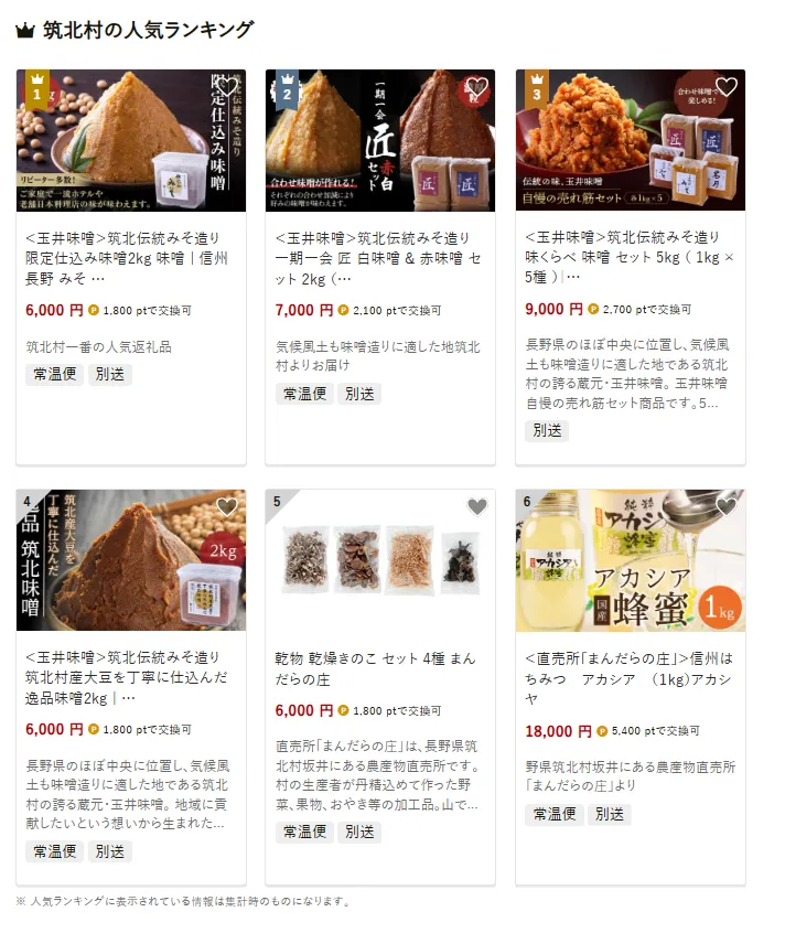 筑北村で人気の返礼品は、筑北伝統のみそ造り限定仕込み味噌2㎏です。地元大豆と米を使い、丁寧に仕込まれた逸品です。他には、乾物の乾燥きのこセットや信州産アカシアはちみつ1㎏も人気。寄付金は、子育て・教育の支援や、里山の自然を守る取り組みに活用されています。