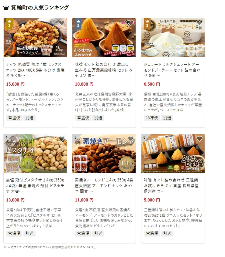 箕輪町で人気の返礼品は、「ナッツ 低糖質 無塩 4種ミックスナッツ 2kg 400g×5袋 」です。厳選されたナッツを無塩・低糖質で楽しめるヘルシーなおやつ。他には「蔵出し生みそ 山万最高級味噌セット」や「ジェラート ミルクジェラート アーモンドジェラート詰め合わせ」も好評です。寄付金は、子育て支援や医療福祉の充実に役立てられています。