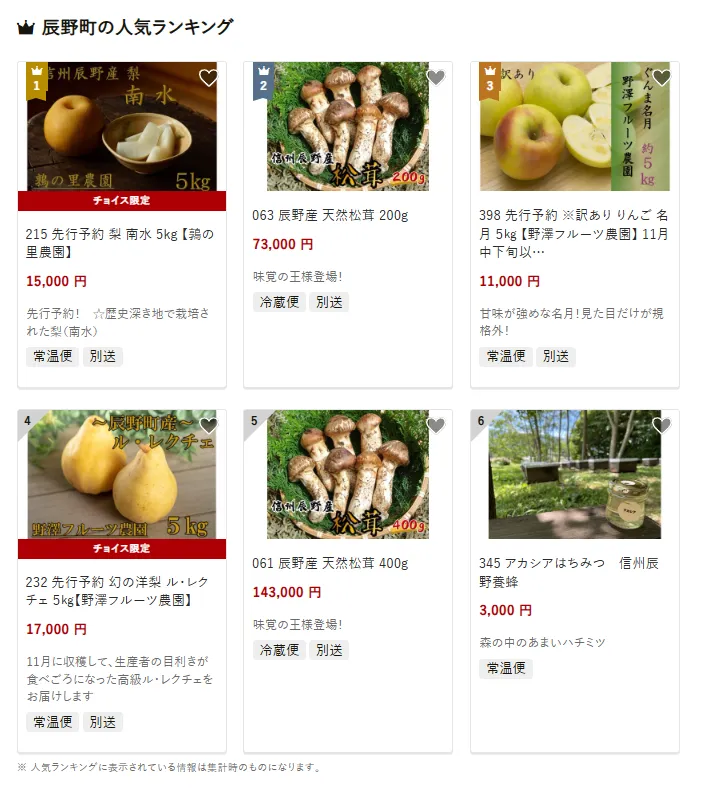 辰野町で人気の返礼品は、鶉の里農園の梨「南水」5kgです。歴史ある土地で栽培された果実は、甘みが強くみずみずしい味わいが特徴です。他には、天然松茸や洋梨ル・レクチェ、信州産アカシアはちみつも人気。寄付金は、子育て支援や高齢者福祉、ホタルの里を守る環境保全に活用されています。