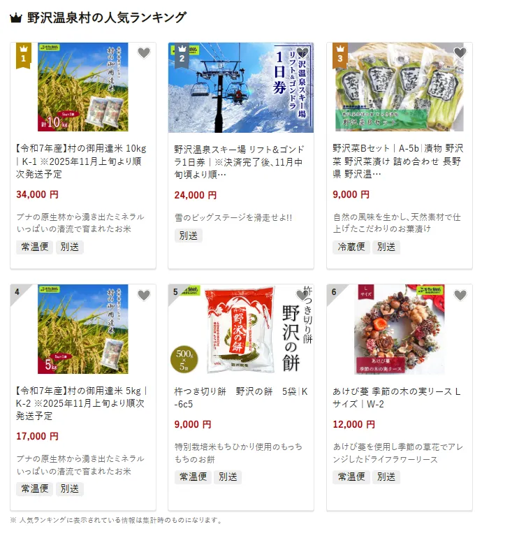 野沢温泉村で人気の返礼品は、「令和7年産 村の御用達米 10kg」です。ブナの原生林から湧き出る清冽な水で育まれたお米は、豊かな自然の恵みを感じる逸品。他には「野沢温泉スキー場リフト&ゴンドラ1日券」や「野沢菜漬け詰め合わせ」なども人気です。寄付金は、観光振興や自然環境保全に活用されています。