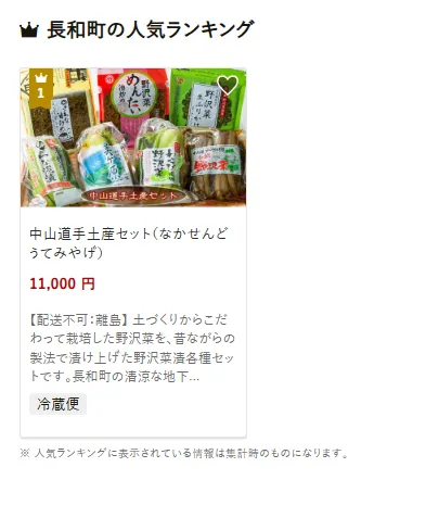 長和町で人気の返礼品は、中山道手土産セットです。地元で採れた野沢菜などを漬け込んだ伝統の味わいが楽しめます。他には、地域で育まれた加工品も好評。寄付金は、教育や高齢者福祉、信州の自然環境保護に活用されています。