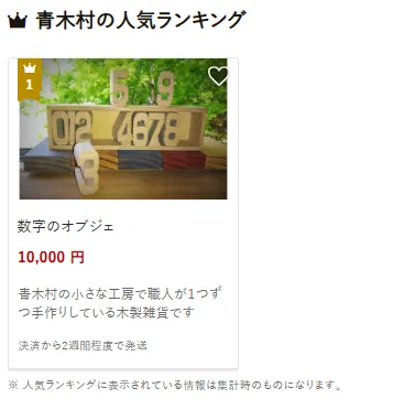 青木村で人気の返礼品は、木工職人が一つひとつ手作りする「数字のオブジェ」です。温かみのある木製雑貨としてインテリアにも最適です。他には小規模工房の木工製品も注目を集めています。寄付金は、子育てや教育支援、村の自然や文化を守る取り組みに活用されています。