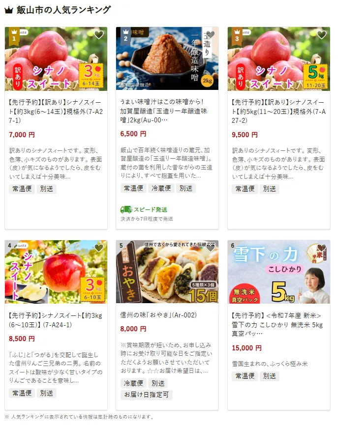 飯山市で人気の返礼品は、りんご「シナノスイート」3㎏(6~14玉)です。甘みが強く食べやすい果実として人気を集めています。他には、伝統の「うまい味噌」や雪下の力コシヒカリ、信州の味「おやき」なども注目。寄付金は、教育や福祉の支援、雪国ならではの地域資源を守る取り組みに活用されています。