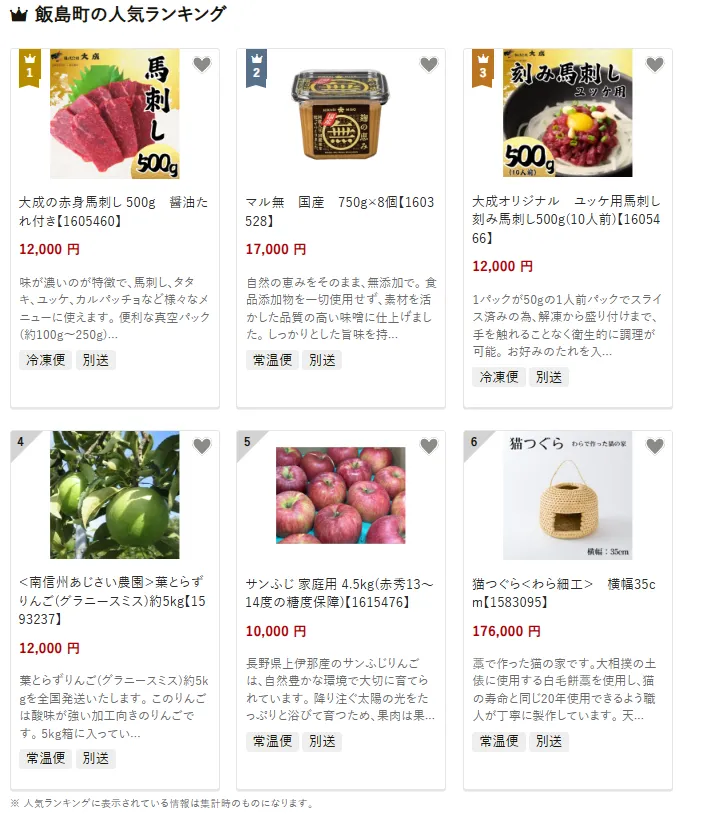 飯島町で人気の返礼品は、「大成の赤身馬刺し 500g 醤油たれ付き」です。大鹿の赤身馬刺しやユッケ用馬刺しなど、多彩な部位を楽しめます。他には、無添加味噌や葉とらずりんごのグラニースミス、サンふじなどのりんご、さらには職人手作りの猫つぐらも人気。寄付金は、教育や高齢者福祉、農業と伝統工芸の継承に活用されています。