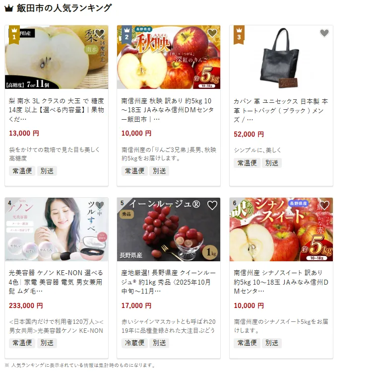 飯田市で人気の返礼品は、糖度14度以上の梨「南水 7or11個」です。大玉で糖度14度以上の高級果実は贈答にも喜ばれます。他には、秋映やシナノスイートなどのりんご、ぶどうのクイーンルージュ、さらに国産レザーを使ったトートバッグも人気。寄付金は、教育や福祉の充実、天竜川流域の自然保全に役立てられています。