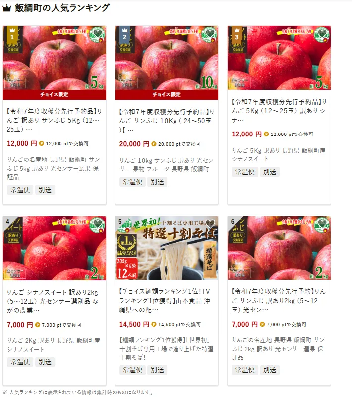飯綱町で人気の返礼品は、りんご 訳あり「サンふじ」5㎏です。光センサーで選別された甘みの強い果実は贈答用にも最適です。他には、特選十割そば12人前やシナノスイートなども好評。寄付金は、教育や福祉の充実、果樹栽培を守る農業振興に活用されています。